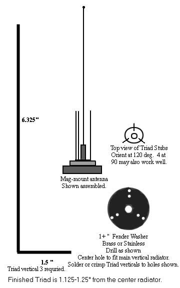 Using suitable material cut three lengths of 3/32-1/8" rod approx. 8.5 inches long. Solder a lug with an appropriate size hole for the base of your vertical radiator to each rod. Measure 1.12-1.3" (depending on primary radiator diameter) from the center of the lug to the outer edge of the bend, bend the rod 90 deg with the lug opening parallel to the radiator, such that you end up with another vertical, repeat this 3 times. Attach to the base of the primary radiator each secondary 120 deg from the last in the horizontal plane forming a rotisserie skewer. Using a MFJ-259 or other suitable means to tune, trim the secondary verticals to the appropriate length, I find 6.25-6.4" works depending on the presence of a loading coil or not. You may also need to shorten the length of the primary 1/4 inch to center the frequency. A stainless steel fender washer with stainless rod crimped or silver brazed to it works nicely as a final product once you determine your exact measurements.